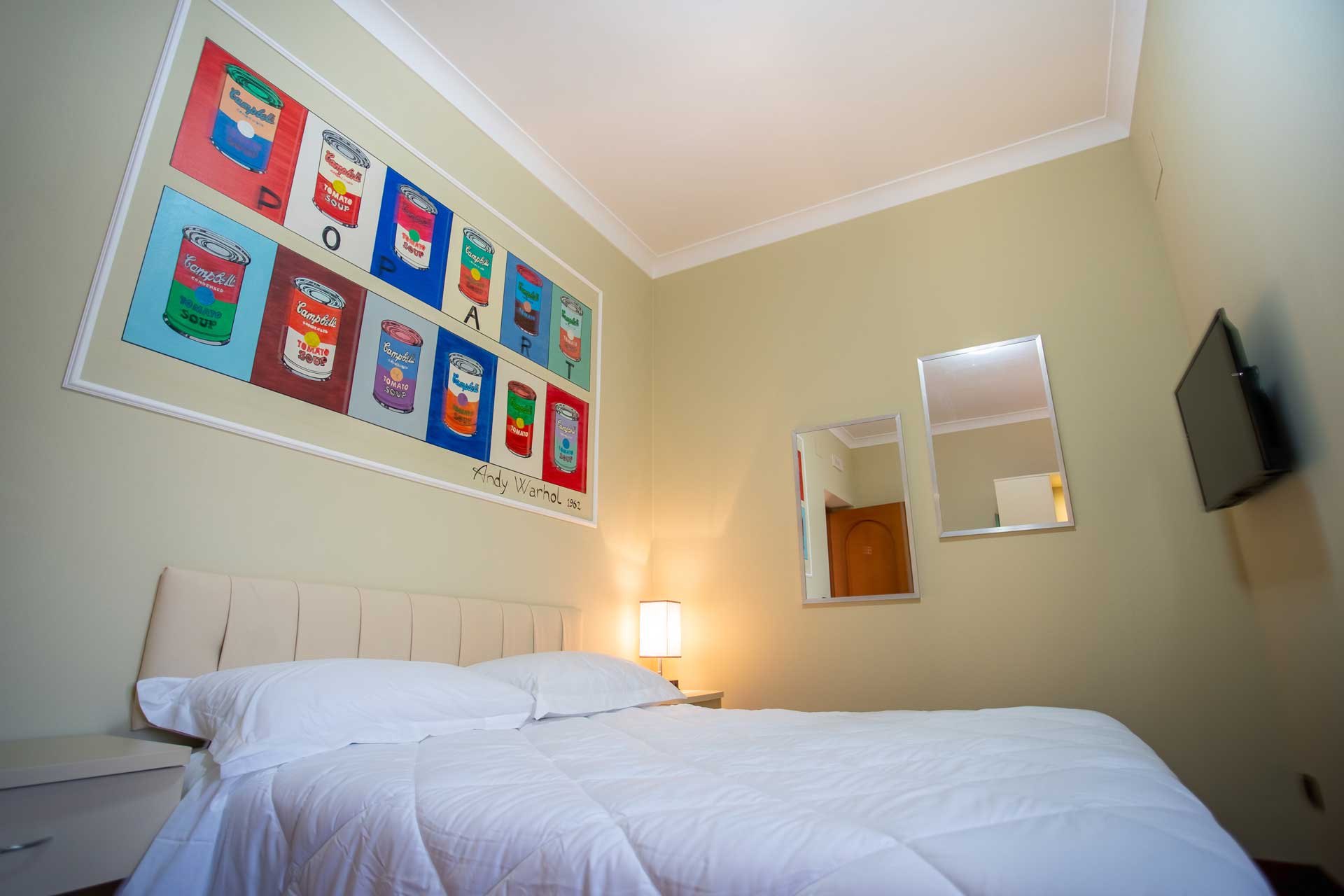 All’interno della stanza, troverete una copia dell’opera di Andy Warhol “Campbell’s Soup Cans“. Questa iconica creazione del famoso artista americano aggiunge un tocco di modernità e originalità alla stanza. L’opera, con la sua vibrante rappresentazione delle lattine di zuppa, diventa un punto focale visivo che stimola la mente e aggiunge una dimensione artistica all’esperienza complessiva.